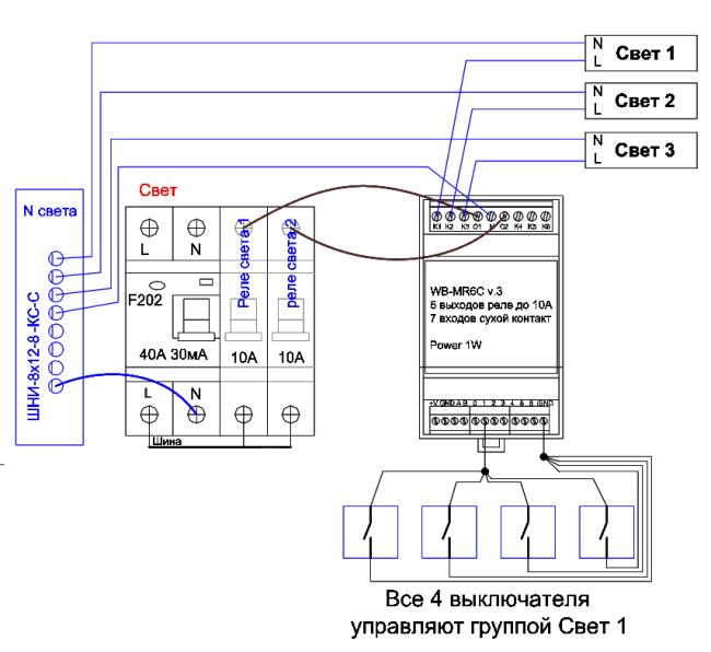 С модулями реле Wirenboard WB-MR6C v.3 мы просто тянем от всех светильников и от всех выключателей кабели в щит, а в щите подключаем свет и выключатели на соответствующие входы реле. При этом любым светом может управлять любое количество выключателей, хоть 10 разных клавиш будут управлять светом. А с одной клавиши можно управлять несколькими группами света сразу простым переключением кабелей на входах модуля (привет дизайнерам, которые делают даже в маленьких прихожих и санузлах по 5 групп света, чтобы заказчик включал их всех ребром ладони по выключателям). А ещё такую систему управления, где вся коммутация находится в щите, на порядок проще обслуживать, потому что всё перед глазами. Особенно если система сделана по проекту или есть исполнительная схема.
