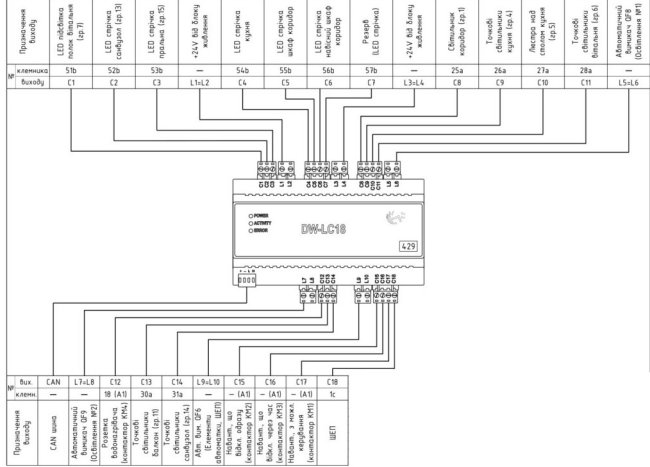 Вот ещё один пример принципиальной схемы, это подключение модуля 18 реле Larnitech DW_LC18.