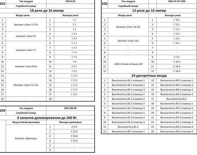Эту таблицу я делаю в Excel и прикладываю к проекту в этом же формате, чтобы заказчик или монтажник могли легко её править. Раз уж я начал использовать в качестве примера Larnitech, то вот таблица для его модулей реле, входов и диммера: