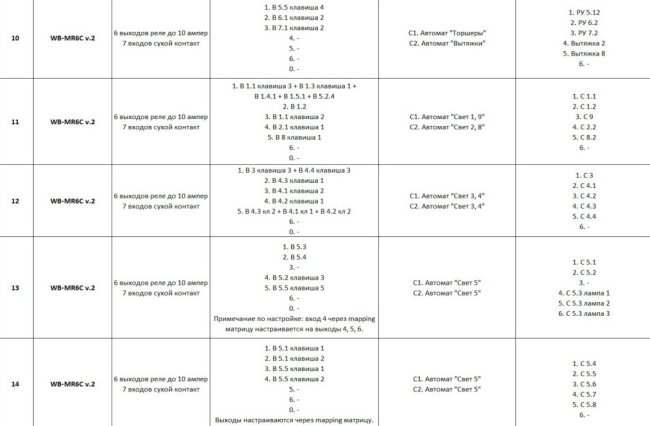 Вот пример фрагмента цоколёвки для Wirenboard. Четвёртый столбец — входы модуля, пятый — входы реле, шестой — выходы реле. Если разбираться, что такое входы и выходы модуля, то всё становится понятно.