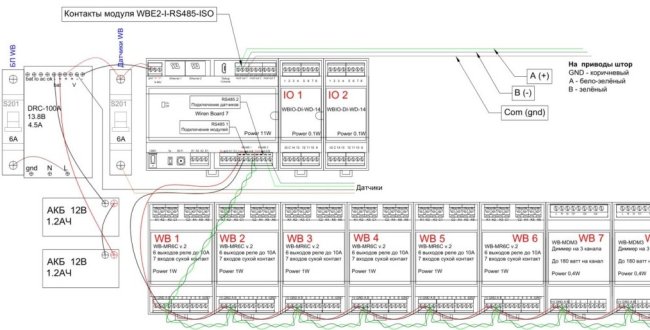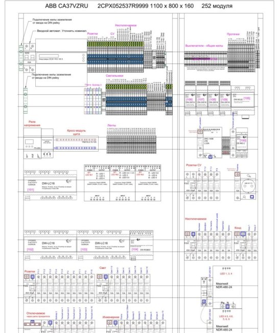 Схема щита — не просто расставленные в щите модули, а комментарии по монтажу, некоторые кабели между элементами, комментарии, назначение элементов.