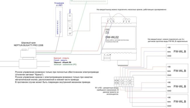 Вот схема подключения элементов к модулю защиты от протечки воды: