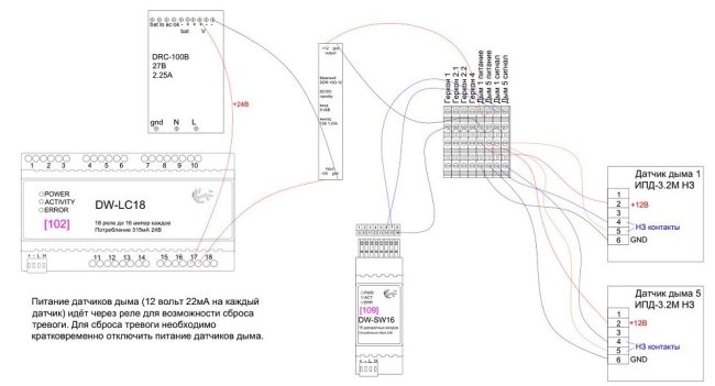Непростая штука — подключение датчиков дыма с НЗ выходом. Сложность в том, что у датчиков питание 12 вольт, и нужна возможность сбрасывать тревогу, кратковременно отключая питание.