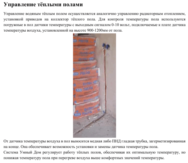 Концепция инженерных систем — это документ в формате PDF, в котором я достаточно подробно простым и понятным языком с картинками, схемами и ссылками описываю работу всех систем дома или квартиры, включая тип кабелей, используемое оборудование, рекомендации по монтажу, принцип работы. Это не просто общая информация о том, какие есть варианты реализации тех или иных функций, это конкретное описание того, как нужно делать на данном объекте с учётом согласованных с заказчиком пожеланий. Концепция — это либо замена проекта, либо (для крупных и ответственных строек) его предварительная часть. Например, полноценное проектирование не вписывается в бюджет. Или клиенту интересно самостоятельно разобраться во всех тонкостях и спроектировать систему, бывает и такое. Или из-за высокой загруженности работой я не могу сделать проект достаточно быстро. Концепция делается быстрее и дешевле, чем полноценный проект, но по ней вполне можно понять, что как должно работать. Если объект крупный и ответственный, то концепция может быть удобна для согласования с участниками стройки всех моментов по тому, что как должно работать. Особенно с конечным пользователем системы. Чтобы не было после реализации системы вопросов наподобие «а почему система не читает мои мысли, мы же, кажется, это оговаривали?». Вот пример содержания файла концепции: По содержанию видно, что концепция распространяется не только на Умный Дом, но и на слаботочные системы: компьютерную сеть, видеонаблюдение, сигнализацию, домофон, контроль доступа, электроснабжение. Там же описаны и способы сопряжения с системами отопления, вентиляции, кондиционирования и прочими смежными системами. Концепция системы — это расширенное техническое задание на проектирование и реализацию системы. В отличие от простой анкеты-техзадания, в которой указывается, нужны или не нужны различные функции, в концепции подробно описано, как какая функция работает: какие кабели откуда и куда, какие модули и датчики, как работает алгоритм управления. Концепция также содержит картинки внешнего вида видимых устройств (датчики, настенные панели, термостаты и так далее) для согласования с заказчиком или дизайнером. Стоимость выполнения концепции систем составляет от 25 тысяч рублей в зависимости от сложности. Срок выполнения от 1 недели после согласования всех пожеланий. Важно понимать, что концепция не включает в себя перечень кабелей или схему сборки щита. Только общее описание того, что как работает. Перечень кабелей и схема щита — это уже мини-проект — следующая ступенька перед полноценным проектом.