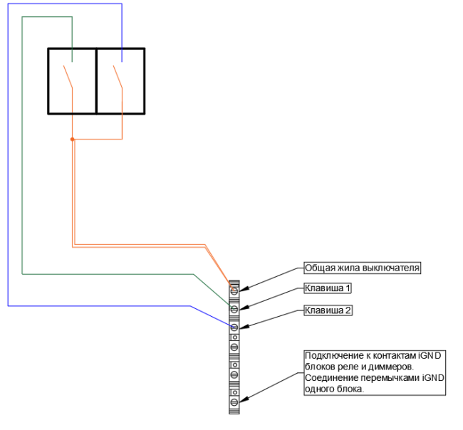 При этом на клеммник заходят только общие жилы выключателей (которые подключаются на iGND), а жилы от клавиш заводятся сразу на входы.