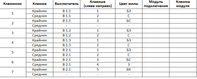 БЗ, С, БС — это обозначения цветов витой пары. В правые столбцы записываются номер модуля и клеммы, куда заводятся эти клавиши. Мне кажется, всё удобно.