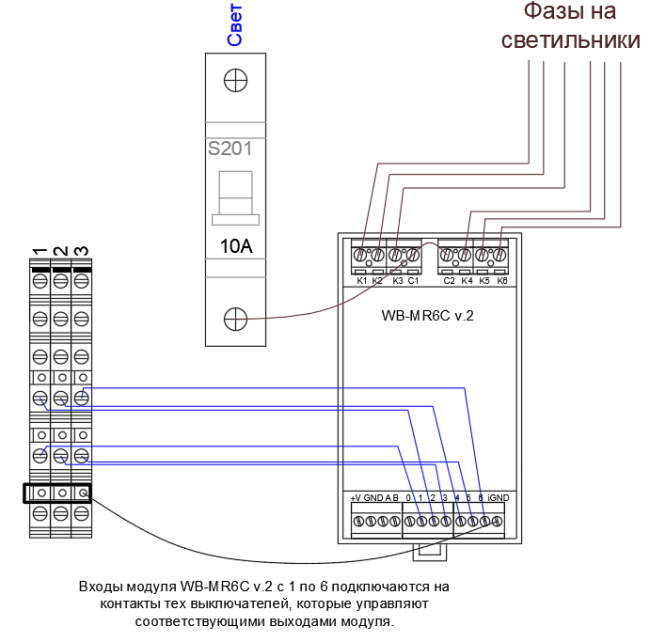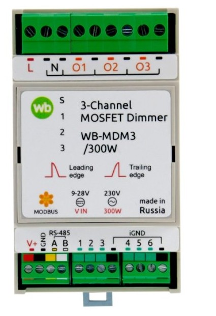 Расскажу про способ подключения выключателей к модулям Wirenboard через 3-уровневые клеммники на DIN-рейку, который я использую в своих проектах. Надо сказать, что использую я его в проектах последние три месяца, раньше было по-другому: без клеммников, дешевле, но менее удобно. Куда подключаются выключатели Для начала напишу, куда в Wirenboard подключаются кабели от выключателей. Есть два основных варианта: на входы модулей реле и диммеров (наименования начинаются с WB-M) на входы модуля входных сигналов WBIO-DI-WD-14 У модулей реле и диммеров Wirenboard есть замечательная особенность — возможность прямой работы выходов (к которым подключены нагрузки типа света, вытяжек и прочего) от входов (к которым подключены выключатели). То есть, если на выход реле №1 подключим светильник, а на вход №1 подключим выключатель, то при нажатии выключателя свет может включаться и выключаться независимо от контроллера и вообще работы всей шины modbus. Модуль реле Wirenboard WB-MR6C При этом выключатель может быть как классического типа с двумя фиксированными состояниями, так и импульсный, с одним фиксированным состоянием, это настраивается в модуле (для этого нужен либо контроллер Wirenboard, либо переходник с modbus на USB). По умолчанию тип выключателей — классический. Если без шины и контроллера модуль может работать, то не может работать без питания 12-24 вольта, это важно. Но сейчас Wirenboard разрабатывает реле WB-MR6C v.3, у которого будет возможность питания от 220 вольт, тогда он и от блока питания не будет зависеть. Вход «0» на модуле реле служит для выключения всех реле модуля, что тоже можно очень удобно использовать. Можно настроить так, чтобы входы работали не напрямую с соответствующими реле, а как-то более сложно. Как это настраивать, я писал здесь. Это называется mapping-матрица. Вот диммер для светодиодных лент, у него три входа для выключателей. В этой статье я писал, какие у нас есть возможности управлять с выключателей лентами разных типов. Диммер Wirenboard WB-MRGB-D Вот диммер освещения (управление TRIAC), там тоже есть разные варианты управления с выключателей. Диммер Wirenboard WB-MDM3 Модуль WBIO-DI-WD-14 используется, когда выключатель не должен управлять подключенной к выходу модуля нагрузкой, а должен делать что-то другое. Модуль Wirenboard WBIO-DI-WD-14 Например, к этому модулю подключаются: Датчики движения, освещённости, герконы и прочие датчики с дискретным выходом, Выключатели, которые управляют шторами и прочими приводами, Выключатели, которые управляют чем-то подключенным по RS-485, Выключатели, которые управляют чем-то разным в зависимости от текущего сценария (наличие хозяев в доме, времени дня и так далее), Выключатели, включающие какие-то режимы или сценарии. Работа выключателей, подключенных к этому модулю, завязана на контроллере Wirenboard, без него работать не будет. Клеммники для выключателей Выключатель надо подключить так, чтобы нажатие клавиши замыкало контакт iGND и вход. Для этого нужно, чтобы iGND всех подключенных к одному модулю выключателей был объединён. Желательно также, чтобы у разных модулей iGND был независимым, это увеличит надёжность работы. Раньше я в проектах использовал клеммник TB-1506, он удобный и дешёвый. Одна штука на один модуль. Крепится на DIN рейку болтами или стяжками. TB-1506 При этом на клеммник заходят только общие жилы выключателей (которые подключаются на iGND), а жилы от клавиш заводятся сразу 