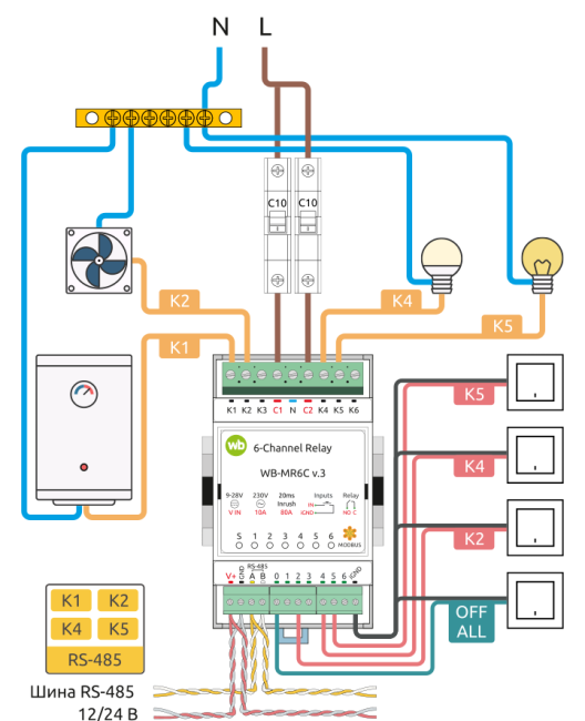 К модулю подключаются и нагрузки через автоматы, и выключатели, и шина связи.