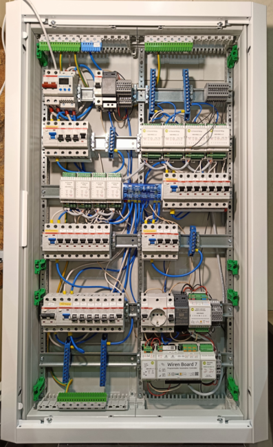 Вот щит электрики и автоматики. В нём поместились и контроллер Wirenboard с модулем ввода-вывода (справа от контроллера), и вся электрическая часть, и модули реле, и модуль контроля протечки воды.