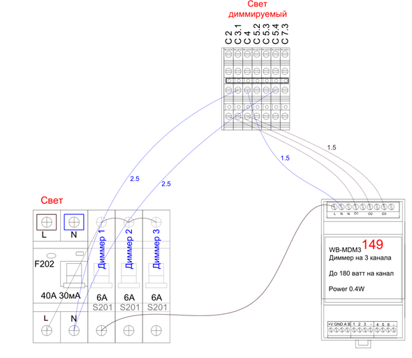 От автоматов питание идёт на диммеры, от диммеров на клеммники подключения светильников. Всё размещается на DIN рейках.
