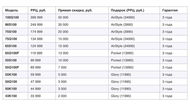 Компания представит модели с QLED+ и Mini LED матрицами с диагоналями от 43 до 100 дюймов. Полный список моделей с розничными ценами на скриншоте: