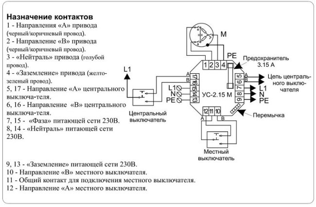 К клеммам 16 и 17 подключается центральный выключатель, он должен подавать на эти клеммы фазу 230В. К контактам 5 и 6 подключается следующее устройство УС, чтобы выключатель подавал сигнал на все модули. То есть, большое количество клемм на устройстве нужно для того, чтобы не понадобилось ставить рядом с ним кучу клеммников.