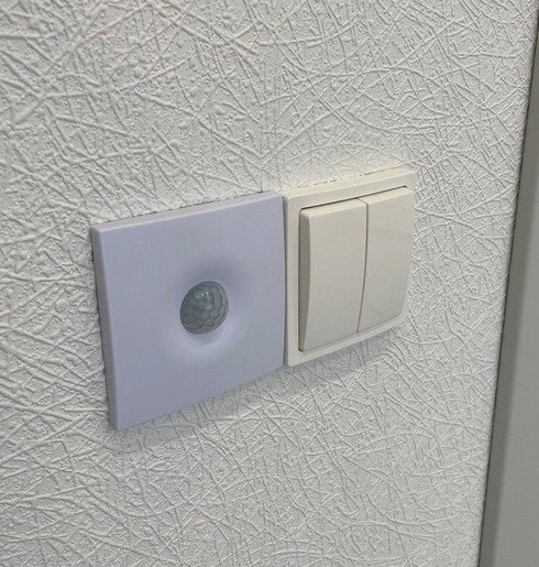 Вследствие этого, датчик расположить так, чтобы он был не заметен, не получится. Спрятать его под розетку или под выключатель тоже. Чтобы он не совсем бросался в глаза посередине стены, можно его расположить рядом с блоком выключателей, при этом высота у него будет чуть ниже идеальной, но вполне допустимой. Сделать так, чтобы он смотрелся гармонично с выключателем, тоже не получится.
