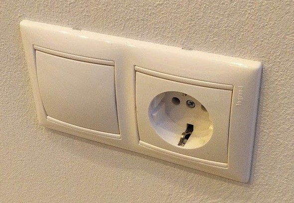 Близость розетки, в которой 230 вольт, обычно не создаёт проблем, между ними достаточное расстояние. Только кабели к датчику и розетке, конечно, надо вести не в одной штробе, а в разных, отнесённых друг от друга. Если у нас не розетка, а слаботочный выключатель (к которому не идут 230 вольт), то можно в одной штробе и в одной гофре. А вот размещать модуль за розеткой точно не следует.