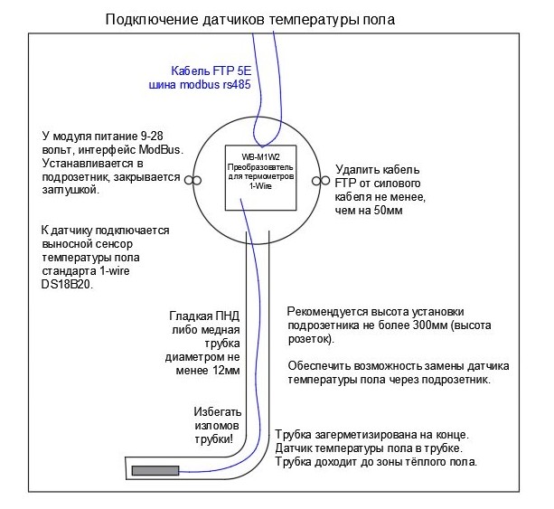 Поскольку к модулю WB-M1W2 подключается не один, а два сенсора DS18B20, можно подключить не только датчик воздуха, но и датчик температуры пола, вынесенный в пол в трубке.