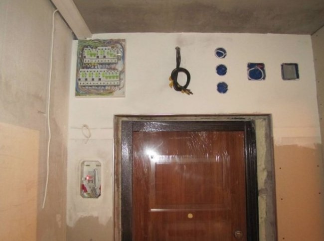 Видите? Основной электрощит над дверью, а в доступном месте у двери вводной автомат и счётчик. Если счётчик на лестнице за пределами квартиры, то вводной рубильник, отключающий питание квартиры, всё равно должен быть доступен. Любой, кто находится в квартире, должен иметь возможность быстро, без стремянки и без раздумий отключить полностью питание квартиры. Поэтому рубильник отключения квартиры в щите ставим в углу (обычно левом верхнем), выделяем красным цветом (красная ручка рубильника и надпись) и учим всех домашних в непонятной ситуации вырубать его.