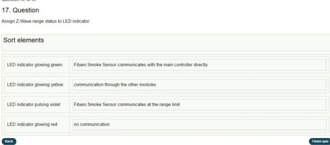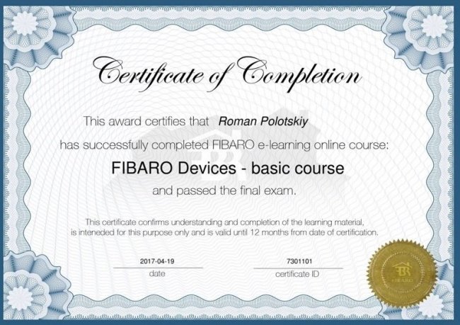 Решил я получить сертификат специалиста по Fibaro оборудованию. Для коллекции, да и, может, что-то новое узнаю в процессе чтения курса. На сайте есть раздел http://e-learning.fibaro.com/, где, во-первых, обучающие курсы по всему оборудованию, во-вторых, тесты и экзамен. По каждому устройству десяток уроков, в каждом уроке может быть несколько тем. Все расписано достаточно подробно и понятно, с картинками и скриншотами. Прочитав каждую тему надо нажать кнопку «Mark read» и можно переходить к следующей теме. Когда все уроки пройдены, можно пройти тест (quiz), там за определённое (очень ограниченное) время надо ответить на пару десятков вопросов, выбирая правильный вариант. После прохождения всех тестов можно пройти экзамен и, возможно, получить какой-то сертификат. Пишут очень подробно. Казалось бы, что можно про датчик дыма написать? А там десяток уроков во всех подробностях. Прохожу тест по датчику дыма. Вопросы, к слову, достаточно сложные, например, что означает мигание сиреневого светодиода или что означает горение жёлтого светодиода. Запомнить это довольно сложно, да и не нужно, я считаю, важно знать, где можно посмотреть. В общем, с помощью открытого в соседнем окне урока отвечаю. Курс по Fibaro Home Center 2 самый большой, но без теста. За неделю я прошёл курсы и сдал тест по темам: Датчик протечки воды Диммер Универсальный бинарный ввод Датчик дыма Датчик движения Универсальное реле Контроллер RGBW Розеточный модуль Модуль управления шторами Датчик открывания двери-окна Надо сказать, что модули сделаны очень универсально. То есть, все датчики поддерживают подключение датчика температуры 1-wire DS18B20 или нескольких датчиков. Все модули, работающие от сети (реле, диммер, модуль управления шторами), умеют измерять потребляемую мощность. Все актуаторы (реле, диммер, модуль штор) имеют входы для подключения выключателей любых типов. Модуль RGBW имеет 4 входа 0-10 вольт постоянного тока для подключения любых датчиков: влажности, осадков, температуры и т.д. Можно подключить метеостанцию с выходами 0-10В. После сдачи тестов по всем темам — экзамен. Экзамен включает 30 вопросов из всех предыдущих тестов (случайные, как я понимаю), на ответ даётся 10 минут. Я правильно ответил на 97% вопросов и получил сертификат о базовых знаниях системы. Сертификат скачивается прямо из личного кабинета после сдачи.