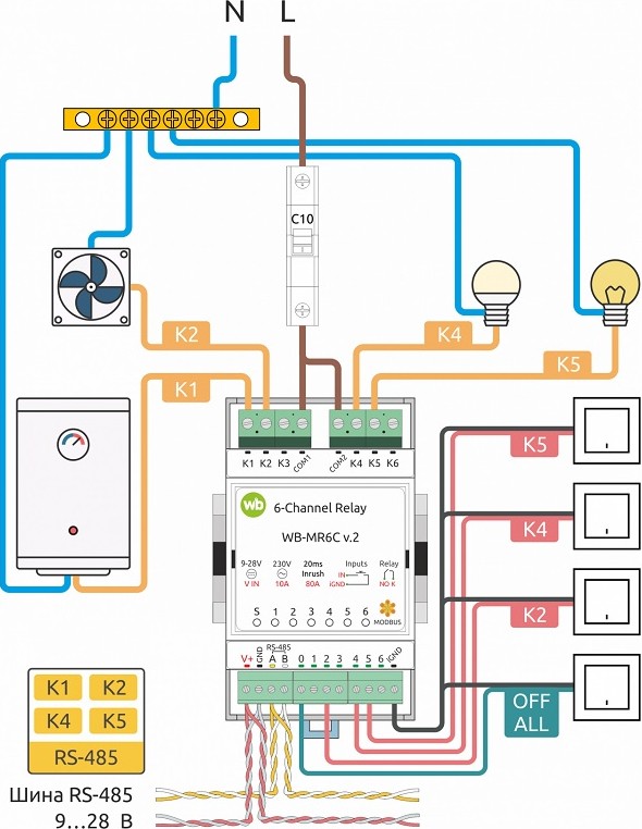 Конечно, у Wirenboard есть модули реле, в которых у каждого встроенного реле отдельный вход. Например, 6-канальное реле WB-MR6LV, но оно занимает вдвое больше места, чем WB-MR6C. Есть компактное 6-канальное реле WB-MRPS6/S, но у него нет входов для подключение выключателей, а они нужны, ведь выключатели, подключенные напрямую к модулю реле света — залог надёжной и быстрой работы.