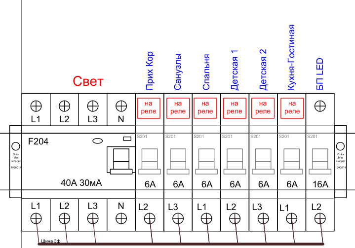 В общем, нам надо распределить весь свет по автоматам, чтобы было удобно. Под каждым автоматом одна или несколько групп реле по 3 штуки.
