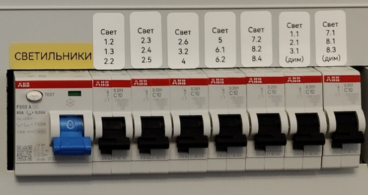 В щитах крупных объектов с большим количеством света можно на автоматах писать просто номер (идентификатор) реле или диммера, вот так: