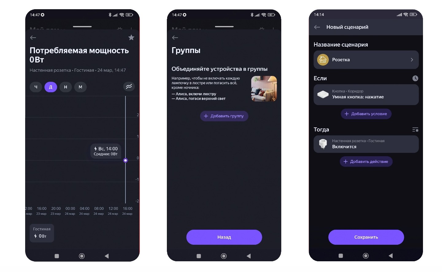 Функционал розетки в Умном доме Яндекс ограничен графиками потребляемой мощности, возможностью объединять устройства в группы и стандартными сценариями.