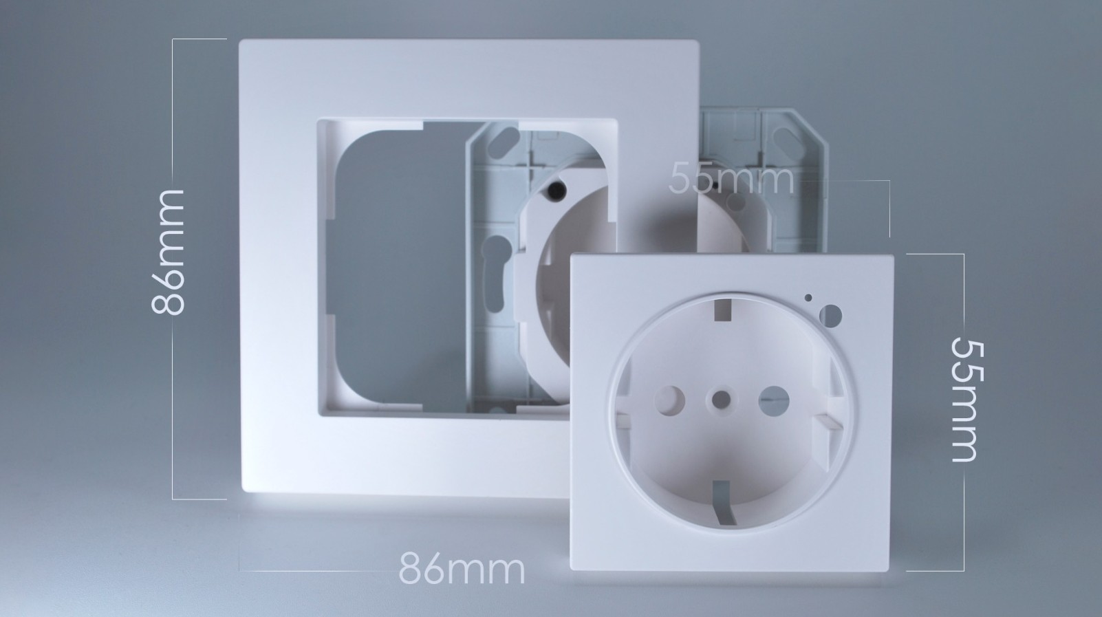 Размер главного модуля розетки составляет 55 мм, что позволяет применять стандартные рамки европейского типа. Глубина внутренней части равна 35мм, что подойдет для большинства подрозетников, используемых в квартирах. Размеры отдельных компонентов розетки указаны на изображении ниже.