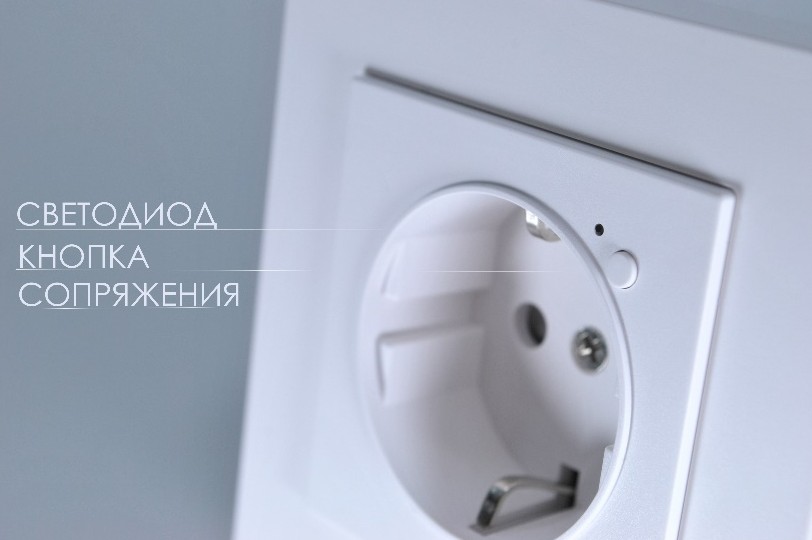 Лицевая сторона устройства представляет из себя классическую модель розетки, изготовленной из белого матового пластика, за исключением того, что в правом верхнем углу расположились – кнопка сопряжения/включения и светодиод, оповещающий о состоянии устройства.