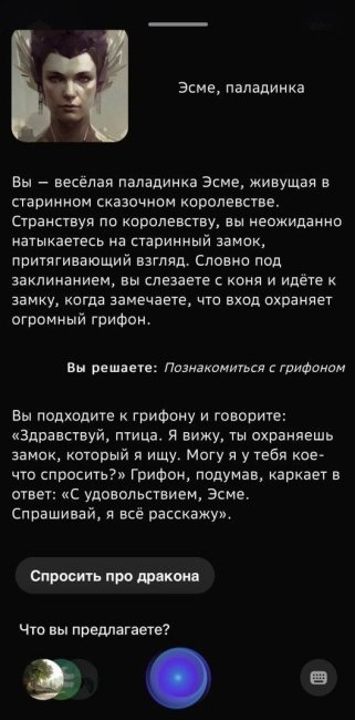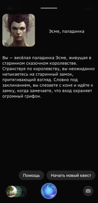 Картинки для персонажа пользователя также созданы нейросетью и вскоре будут генерироваться для каждого шага сюжета. Фэнтези — первый из многих жанров, над которыми ведётся работа. Скоро пользователи виртуальных ассистентов Салют смогут генерировать квесты и в других жанрах.