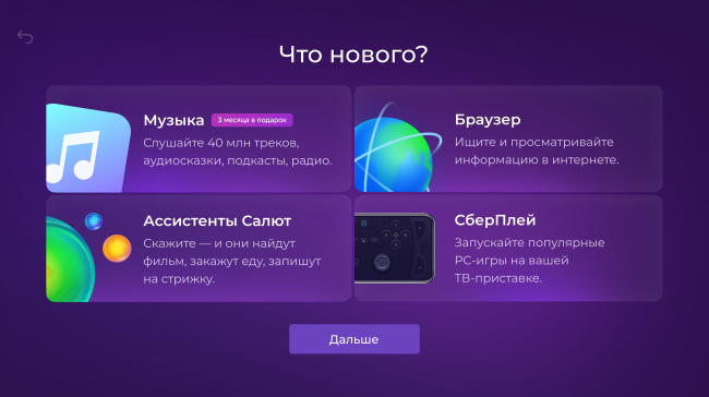 В SberBox встроены браузер, радио, стриминговый сервис SberPlay, который позволяет запускать популярные компьютерные игры на ТВ без необходимости покупки дорогой игровой консоли или мощного ПК. Также в SberBox «живёт» полный каталог сервиса быстрой доставки продуктов Самокат и есть возможность управлять «Умным домом» Sber.