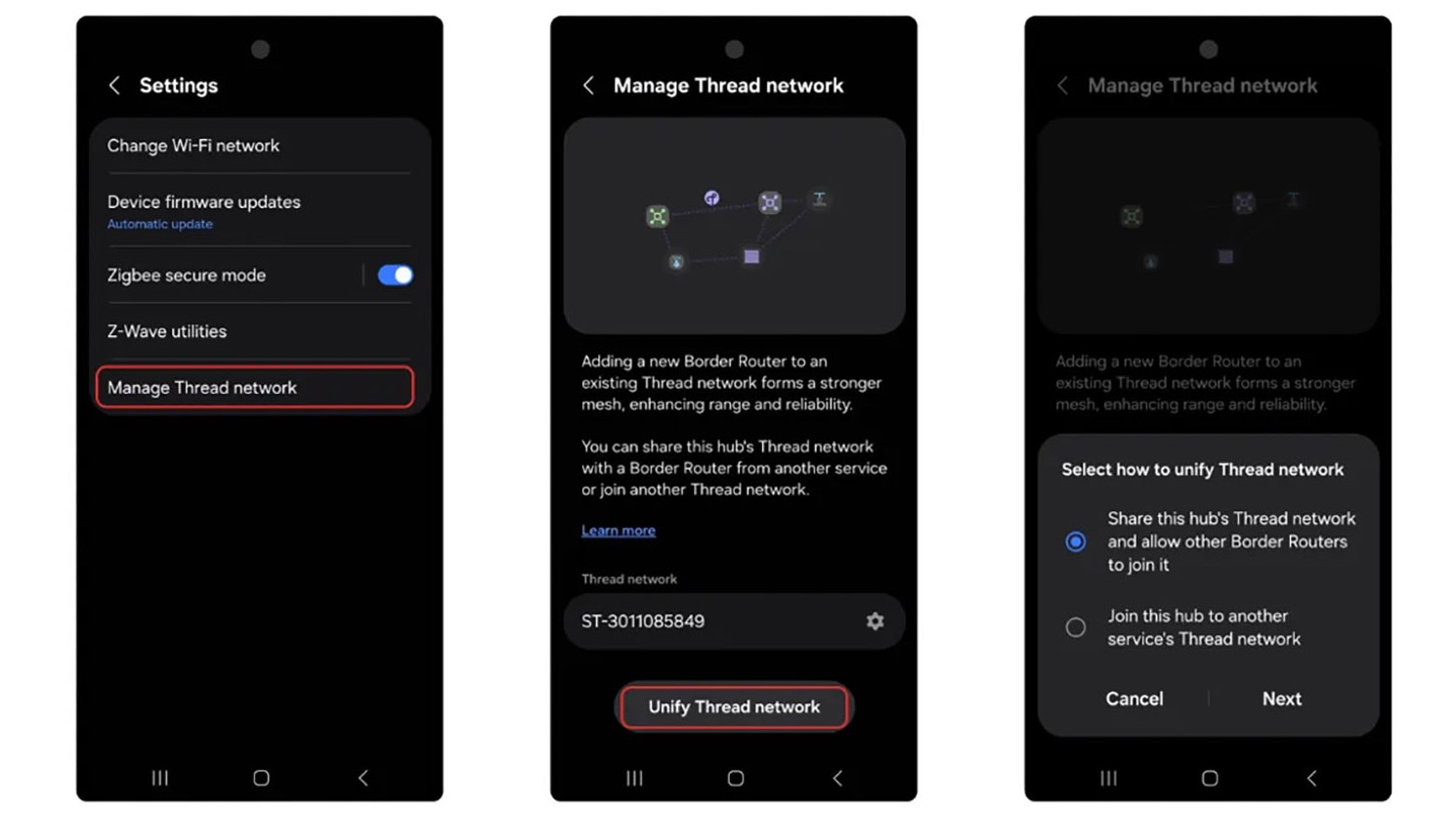 Новое меню «Управление сетью Thread» в приложении SmartThings позволит подключить совместимый концентратор к существующей сети Thread с помощью QR-кода или одноразового пароля. Оно также позволит добавить сторонний пограничный маршрутизатор к существующей сети Thread хаба SmartThings.